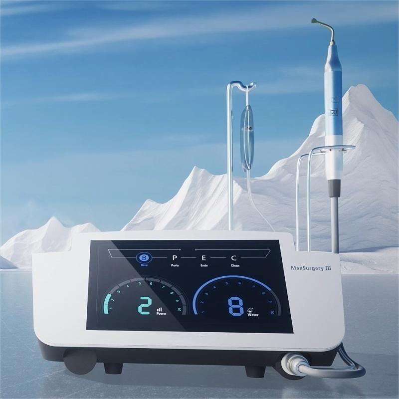 The piezoelectric mechanism converts electrical energy into ultrasonic vibrations at 26 ± 3 kHz, precisely cutting mineralized bone while sparing soft tissues. The built-in cooling system continuously emits a water mist to manage heat and maintain clear vision of the surgical field, enabling smooth performance and rapid recovery.